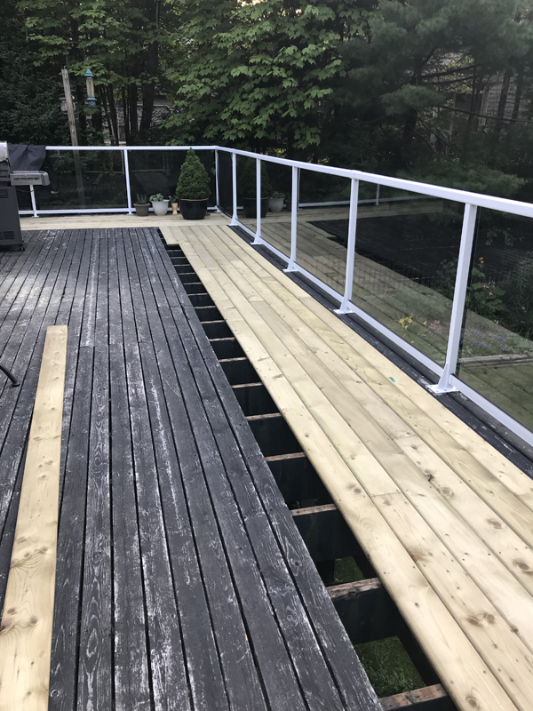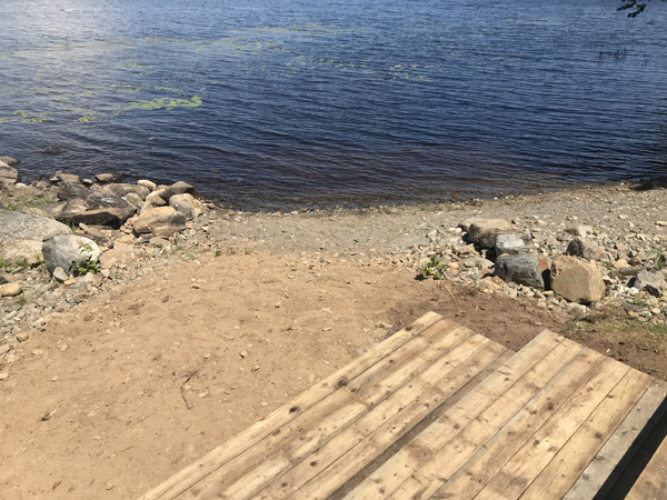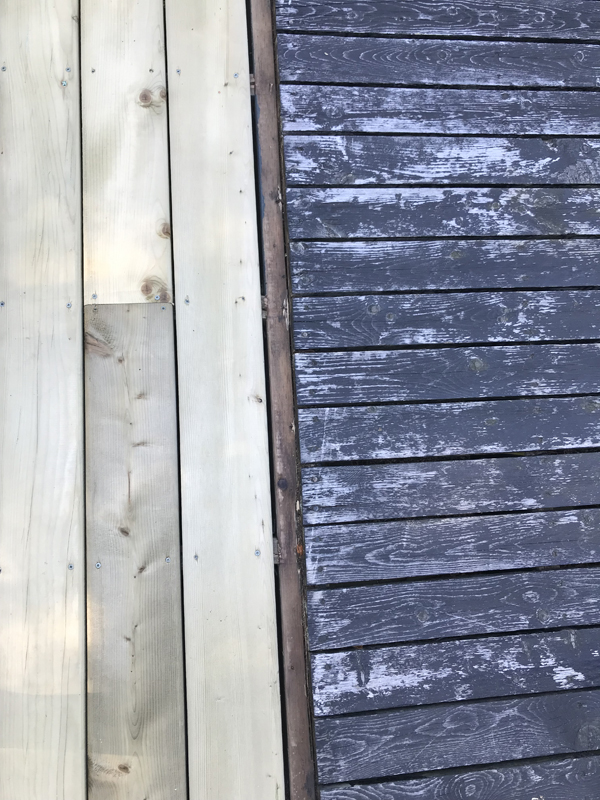 Last year during this exact time, during what is becoming the annual July hot spell, The Doc and I worked and sweated for over a week straight, removing the old boards from our very large deck and replacing them with nice, new, smooth, unstained, unpeeled ones. This came about because we decided that we wanted to build a deck area at the waterfront where the ground was sloped and rocky and weedy and not conducive to spending a lot of time on other than to launch kayaks and watch the grandkids when they swam. During this discussion we talked about having to purchase brand new deck boards to make this deck area. That’s when the light bulb came on. Why purchase new boards for down by the water? Why not purchase new boards for the deck of the house and repurpose the old ones down by the water? This is what happens when projects get discussed. My brain cascades into a domino series of thoughts that end up making projects twice as large as originally intended. But this was too big of a job for one summer and too big of a job for us to do on our own. We were able to do the house deck ourselves but we needed to hire experts to build a deck area on sloped, weedy, rocky ground.