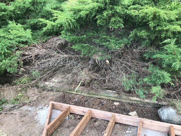 So exactly a year later, we can’t go kayaking or to the beach because the carpenters are down by the lake building us a deck with our repurposed boards while we wait for it to be completed, which seems to be taking, like every construction job seems to do, more time than originally planned. First it was supposed to happen the second week of July but got postponed by a week. Then they didn’t come on the day we thought they were, which was a Monday. They showed up on Tuesday. They being the carpenter we hired and two others who proceeded to carry supplies and a generator down the hill and who began digging and leveling and building the supports and frame for the deck. They also took the liberty of hacking off the fronts of two of our juniper trees. I was not impressed. They didn’t ask before they did it. I am sure we could have trimmed them a bit cleaner and perhaps tied up some branches that were in their way.