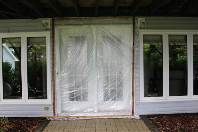 The Doc arriving home a few minutes later, jumped into action. (OK maybe not jumped, I do recall him taking a few minutes to check something on his phone first.) Anyway with his trusty drill he fastened a frame of plastic sheeting around the door to prevent additional water seepage. Gotta love a man with a cordless drill and sheet plastic and spare wood. The plastic was a bit flimsy, and we weren’t sure how well it was going to hold up.