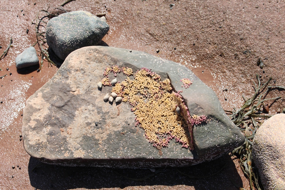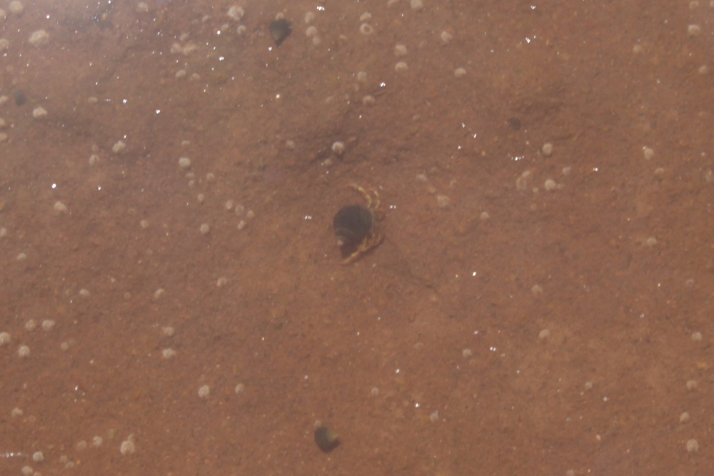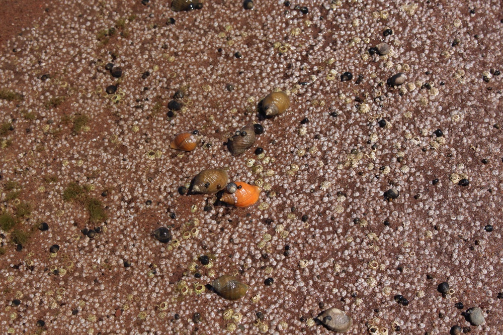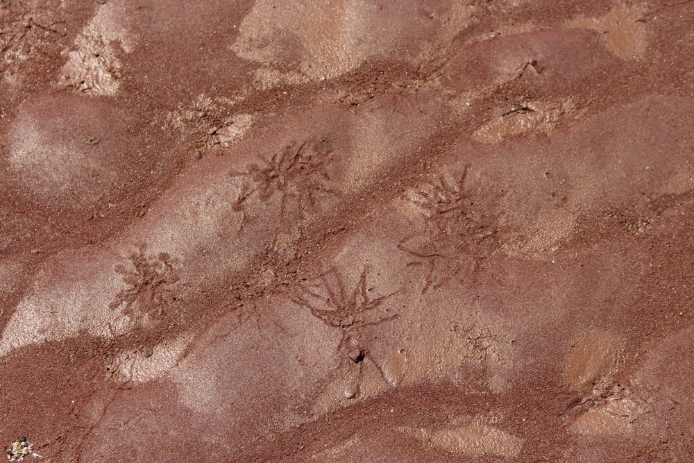 There are signs of ocean life, periwinkles and small hermit crabs and signs of the movement of creatures now buried until the water returns.