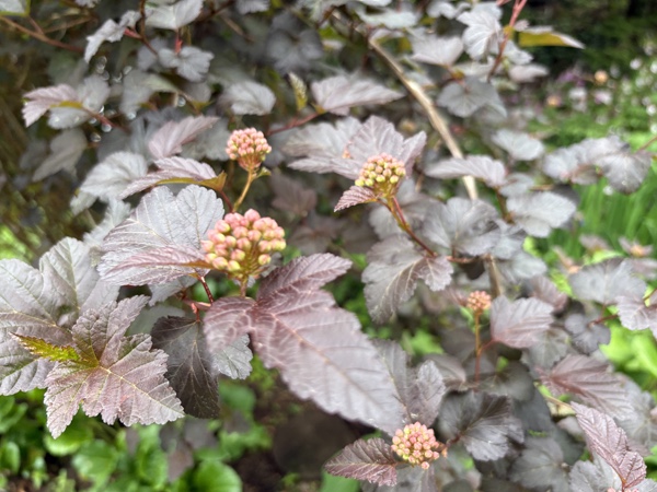 The Ninebark make such a statement with their foliage that you can forget that they actually bloom. They are easy to grow and they grow fast, which is why I created a hedge of them across my front yard this year. Plus they are deer resistant.