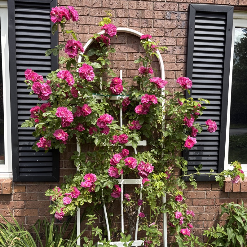 So that is how I ended up with the Canadian-bred, John Franklin climbing rose. Every year it puts on a very lovely show; and other than me not getting to it in time with insecticidal soap to prevent its leaves from being eaten by some insect or another that loves to call my garden home, it poses no problems.