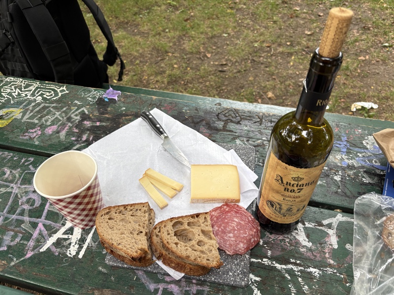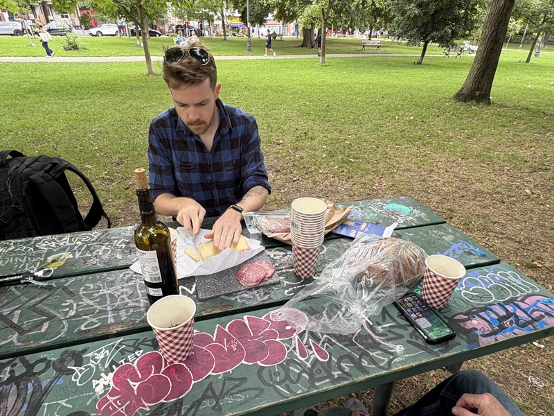 On College Street there was a great little cheese shop called La Fromagerie where we picked up some cheese from Quebec and a package of sliced meat. Then we headed to Trinity Bellwoods Park for a picnic. JT had packed a very nice bottle of wine (and a corkscrew), a loaf of bread from his favourite bakery, a knife and a small cutting board. He proceeded to pour the wine make us a lovely charcuterie picnic. Of course, it was delicious.